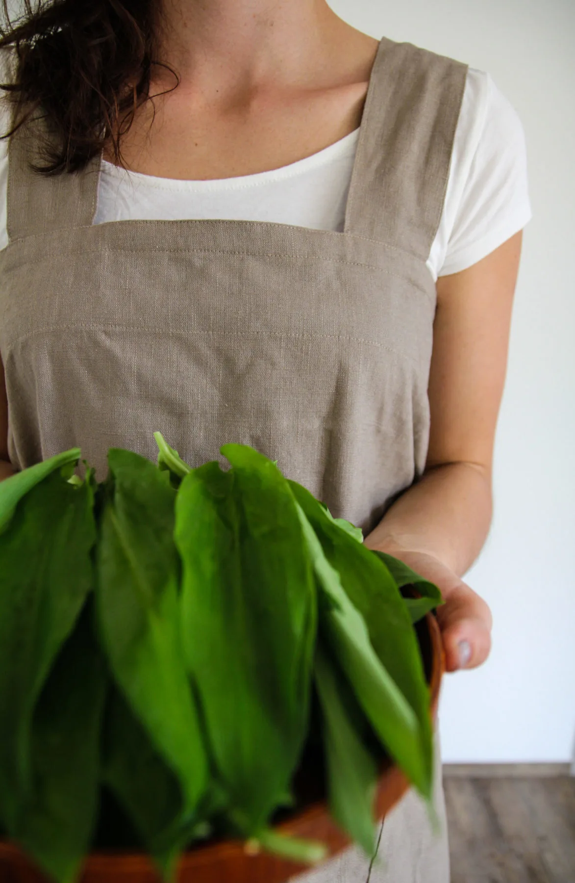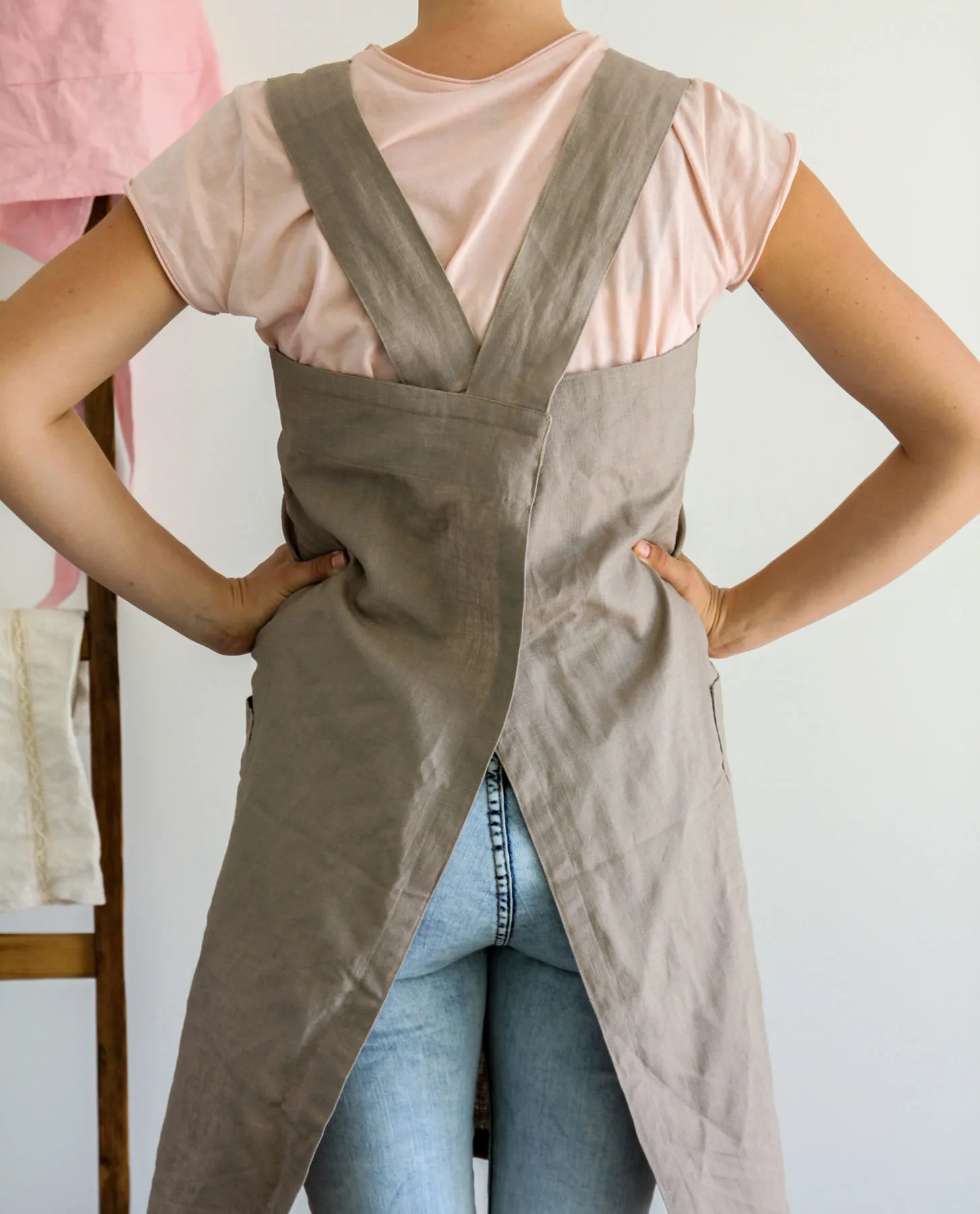 Je ušita se širokými křížícími se popruhy na zádech, stačí ji jen přetáhnout přes hlavu bez vázání – zaručená rychlovka. Popruhy jsou dostatečně široké, aby zástěrka nesklouzávala a pohodlně se nosila klidně i po celý den. Len navíc chrání svými přirozenými vlastnostmi i v letních vedrech, protože chladí a zároveň chrání před UV zářením.